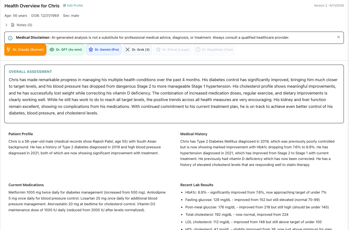 Building a your personal AI Doctor(s) by integrating your favorite LLMs. Analyze your and your family reports, chat